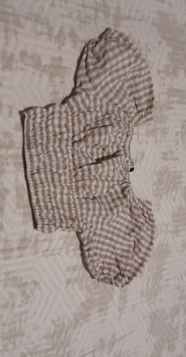 Bej ve gri ekoseli keten bluz, tekne yaka ve fırfır detaylıdır. Kısa balon kollu, bol ve kısa kesimdir, rahat sokak stili için uygundur.