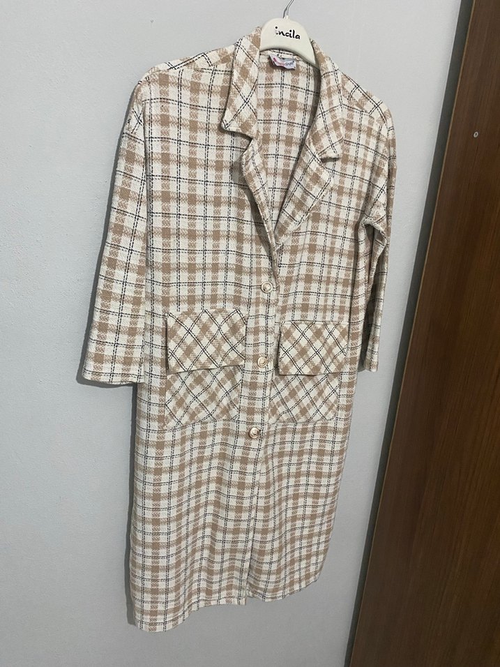 Bej renkli uzun kaban, ekoseli desenli ve düğmeli. Uzun kollu, kesik yaka ve iki ön cepli, bahar sezonları için birebir trend sokak stili için uygun.