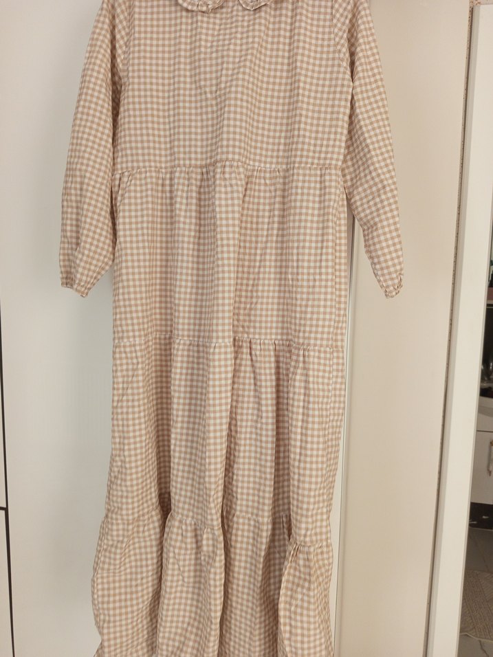 Bej ekoseli, keten kumaştan yapılmış uzun elbise. Fırfırlı, bol kesim, uzun kollu ve tekne yakalıdır. Rahat bohem tarzıyla günlük kullanım için uygundur.
