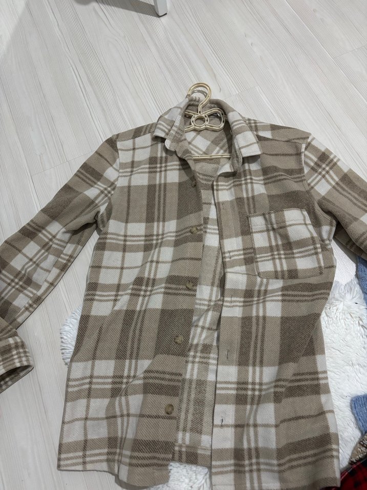 Bej ve gri ekoseli, düğmeli, yakalı ve uzun kollu, rahat kesim keten gömlek. Günlük kullanıma uygun.