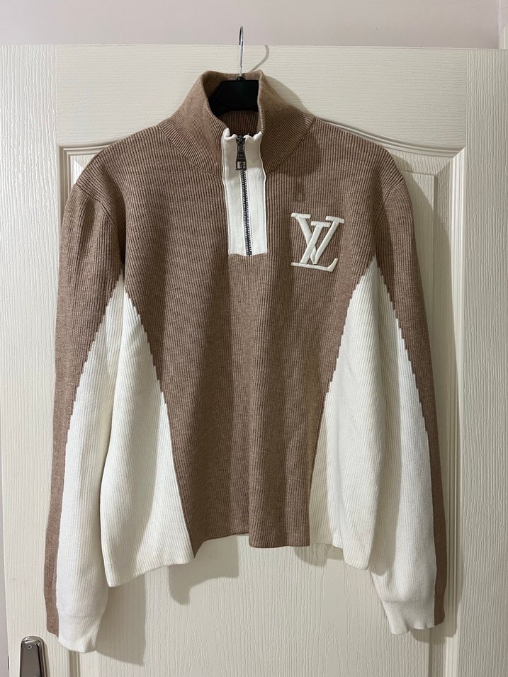 Yarım fermuarlı, uzun kollu, yüksek yakalı triko kazak. Bej ve Ekru renkleriyle günlük kullanım için rahat ve salaş bir stil sunar. LV logosu ile tasarım dokunuşu sağlar.