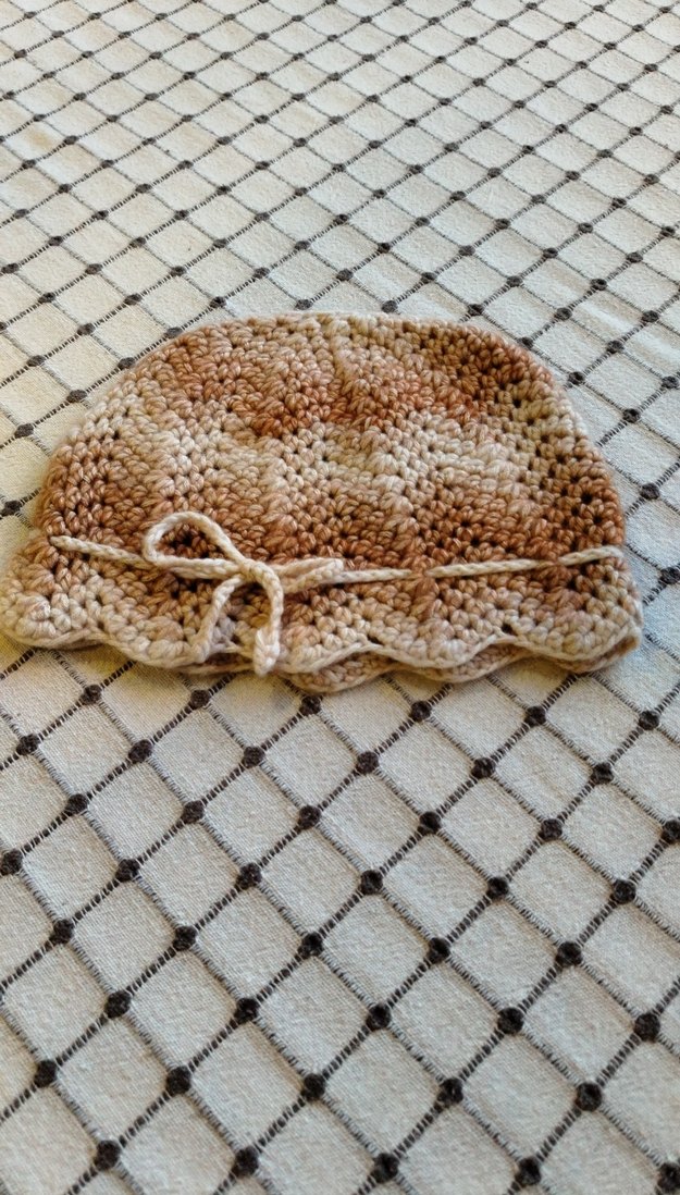 Hafif bej renkte, örgü dokulu kadın bere. Kenarında bağcıklı, rahat ve bohem tarzda bir tasarım.