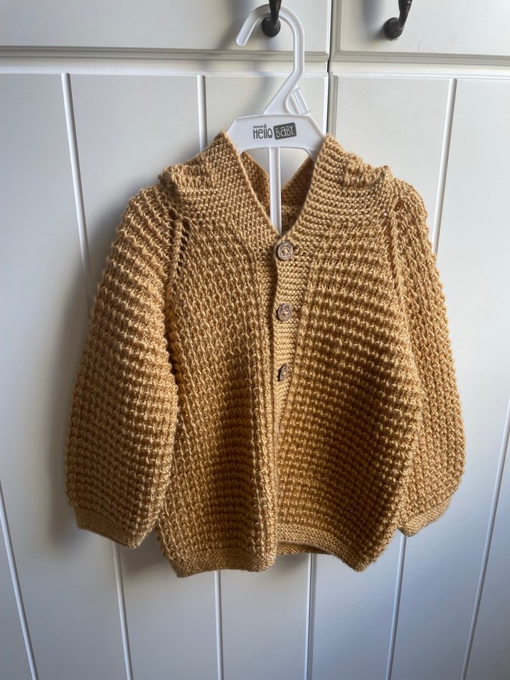 Bej renkli, örgü dokulu el örgüsü çocuk hırkasıdır. Rahat, bol kesim ve uzun kolludur, düğmeli ve desensizdir. Kız ve erkek çocuk için tercih edilebilir unisex bir ürün.