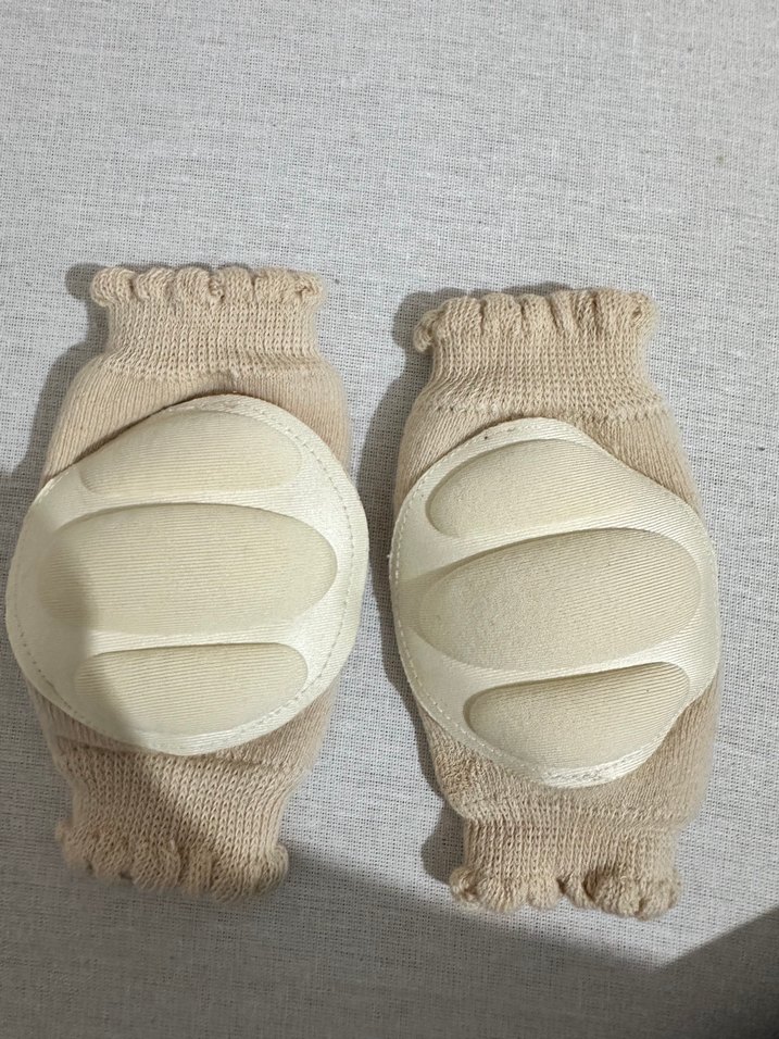 Bej renkli, elastik diz koruyucular. Emekleyen bebeklerin dizlerini korumak için kullanılıyor .