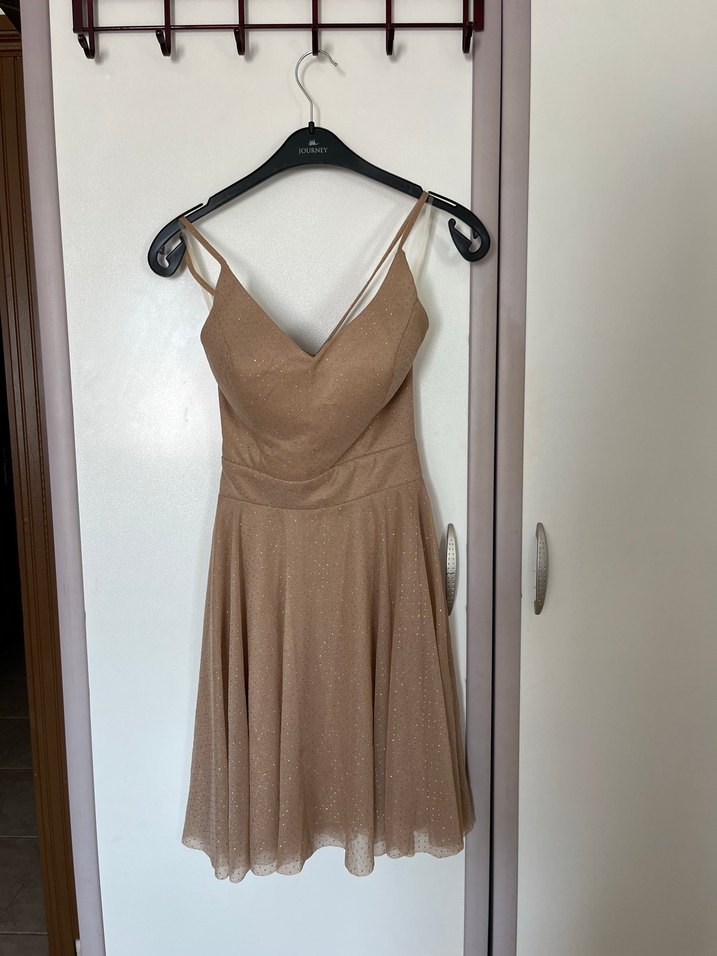 Bej renkli, ince askılı, V yakalı, drapeli detaylara sahip, parlak midi elbise. Düğün için uygundur. İçinde göğüs pedi var normalde etikette 34 yazıyor fakat göğüs kısmı 36 bedene daha uygun