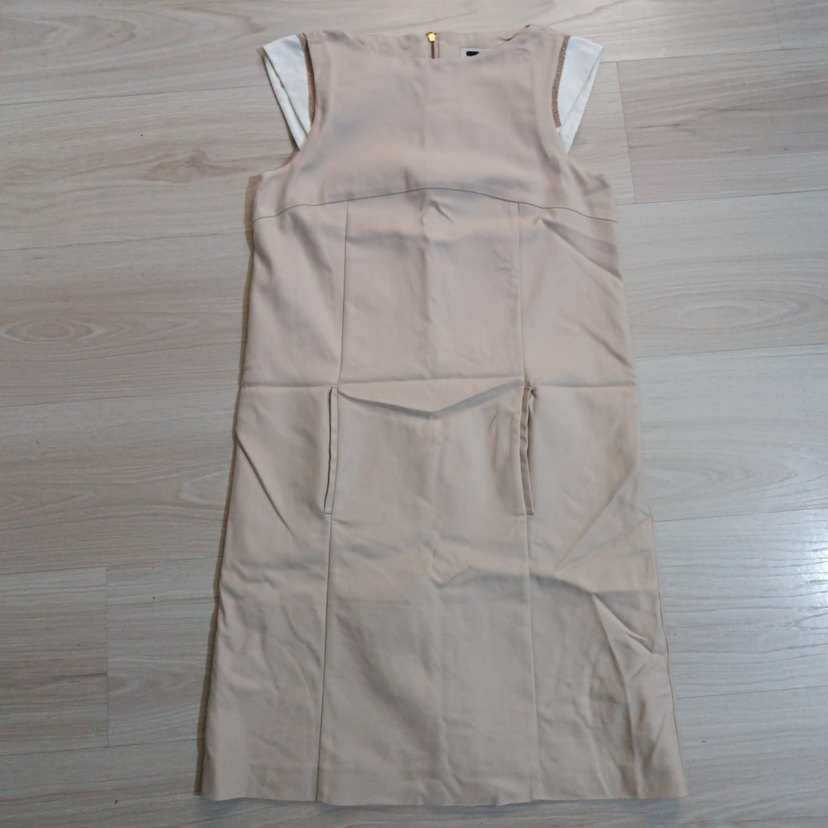 Yumuşak pastel tonlu, desensiz bej elbise.