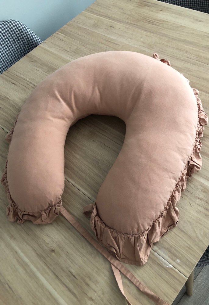 Pastel bej renkte, yumuşak kumaşlı ve fırfırlı kenarları olan desensiz hamile ve emzirme yastığı.