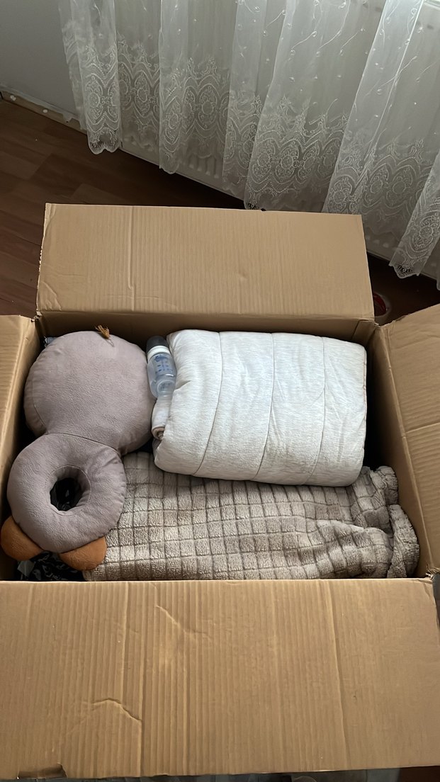 Yumuşak dokulu bej hamile ve emzirme yastığı, gri peluş boyun yastığı ve bej kareli battaniyeden oluşan set, kutuda düzenli şekilde yer alıyor. ️