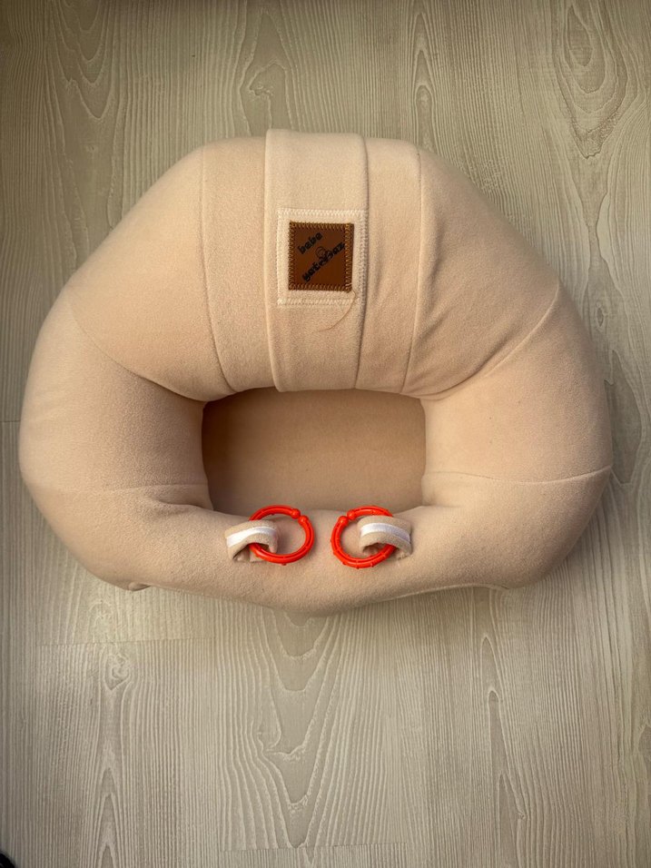 Yumuşak, bej renkli ve pastel tonlarında, emzirme ve hamilelik için destek sağlayan klipsli yastık.
