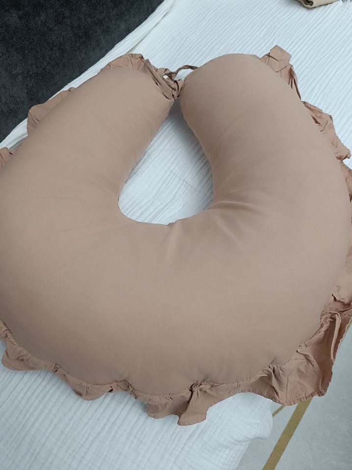 Hamilelik ve emzirme için bej renkli, yumuşak kumaş kaplı, kenarları hafif fırfırlı konforlu yastık.