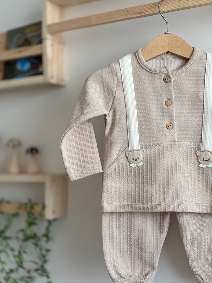 Ürünün bedenleri: 9-12 ay, 12-18 ay, 18-24 ay, 24-36 ay Bej renkli erkek bebek takımı, yuvarlak yaka ve düğmeli ön kısımla. Ayı figürlü askılı detaylarıyla yumuşak ve rahat bir tasarım.