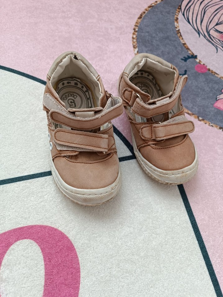 Bej renkli, lastik tabanlı ve velcro bantlı erkek bebek ilk adım ayakkabısı. Pastel tonlarıyla trend sokak stiline uygundur.