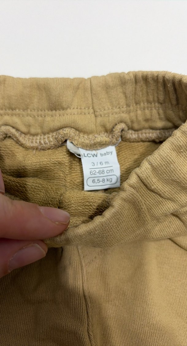 Bej renk, keten kumaştan yapılmış, düğmeli ve bol kesim erkek bebek pantolonu. LCW Baby markasına ait, 3-6 ay bedeninde.