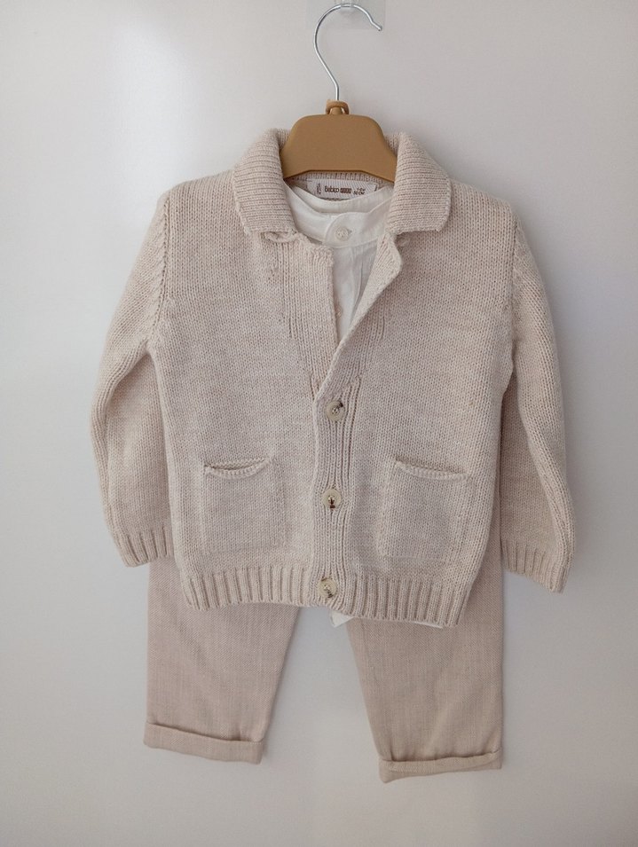 Bej renkte, yakalı ve uzun kollu örme triko hırka ile uyumlu triko pantolondan oluşan bebek erkek takım. Pastel tonlarda, desensiz ve sade tasarım. 9,12,18,24 Ay seçenekleri ile...