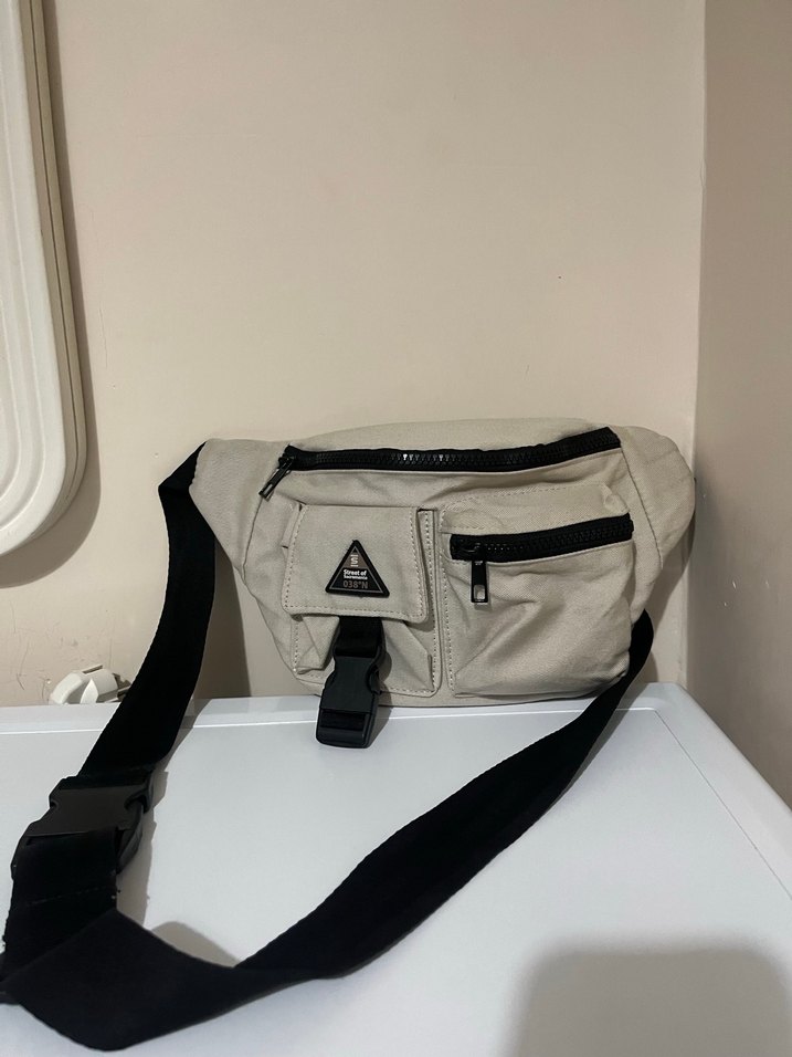 Bej renkli, siyah kayışlı erkek bel çantası. Sentetik kumaştan, çoklu fermuarlı ceplere sahip. Dış mekan street style için uygun.