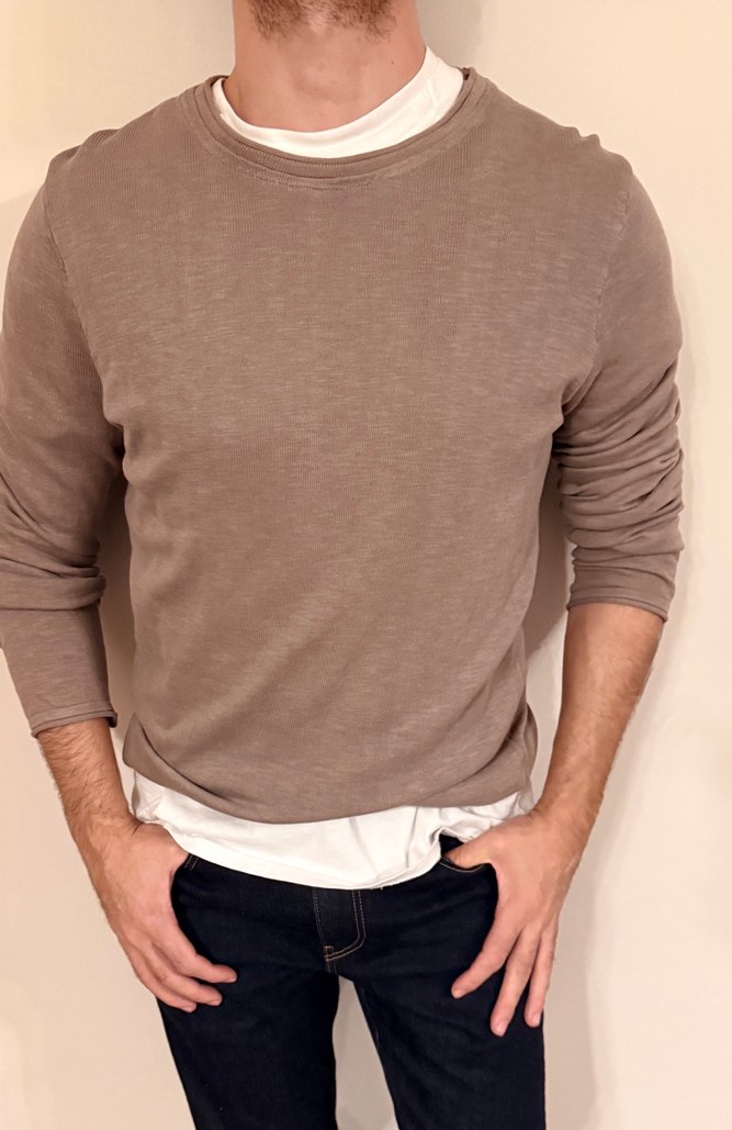 Bej renkli, bisiklet yaka ve ince triko kumaştan yapılmış erkek kazak. Uzun kollu, vücuda oturan kesimiyle gündelik ve normcore tarzda, desensiz ve rahat bir şıklık sunar.