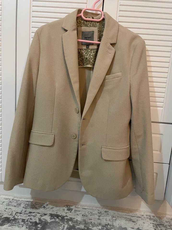 Bej renkli, düğmeli, uzun kollu Erkek blazer ceket. Sentetik kumaştan, normal kesim ve dik yaka detaylı. Ofis ve günlük kullanıma uygun.
