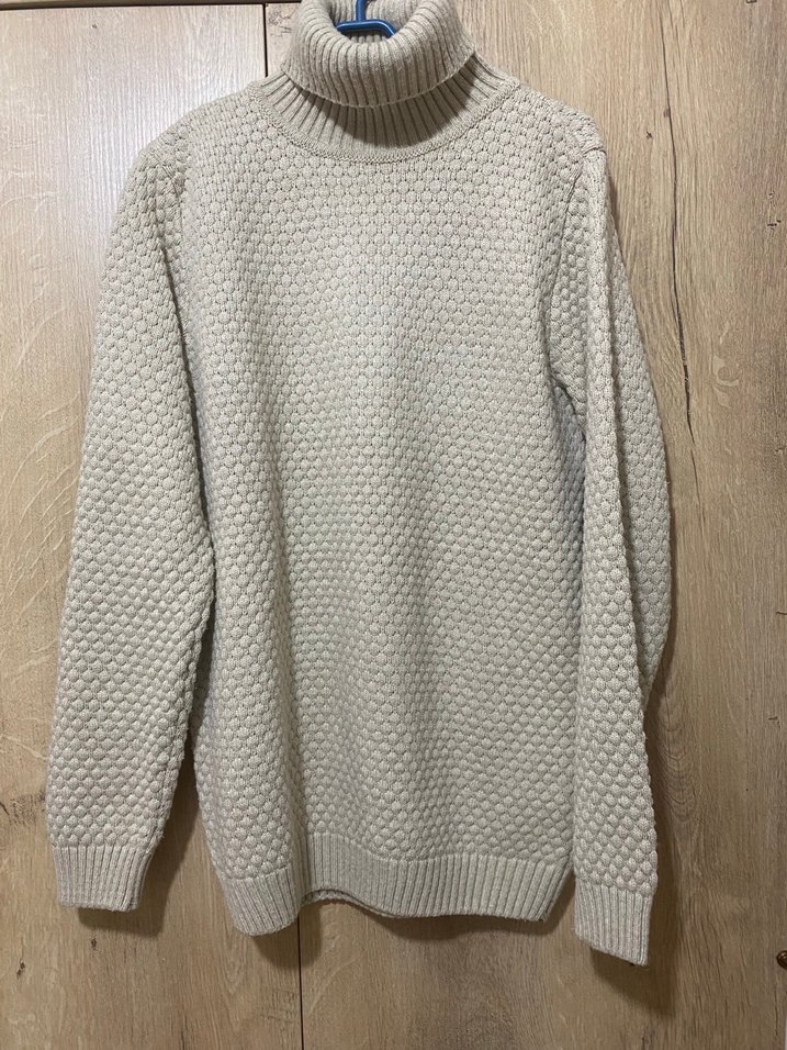 Bej renkte, boğazlı ve uzun kollu, örme dokulu erkek kazak. Normal boyda ve rahat kesimlidir, günlük kullanım için uygundur.