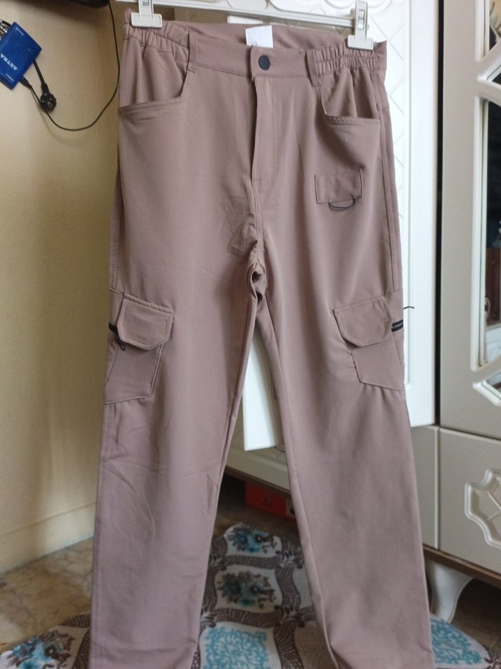 Bej renkte, belden kemerli, bol kesim erkek kumaş pantolon. Çoklu cepleriyle günlük sokak stiline uygundur. Yumuşak sentetik kumaştan üretilmiştir.
