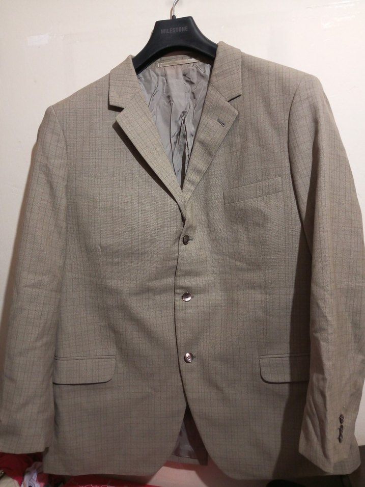 Bej ve gri tonlu, düğmeli, klasik kesim erkek ceketi. Ofis kullanımı için uygun, uzun kollu ve desen içermeyen şık bir parça. ✨XL-XXL bedene uygun.