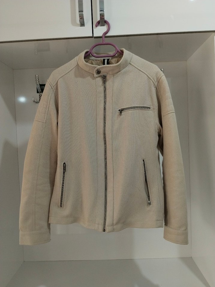 Bej renkli, çok tarz duran ceket kolunda küçük bir yerinde ip takılmış.