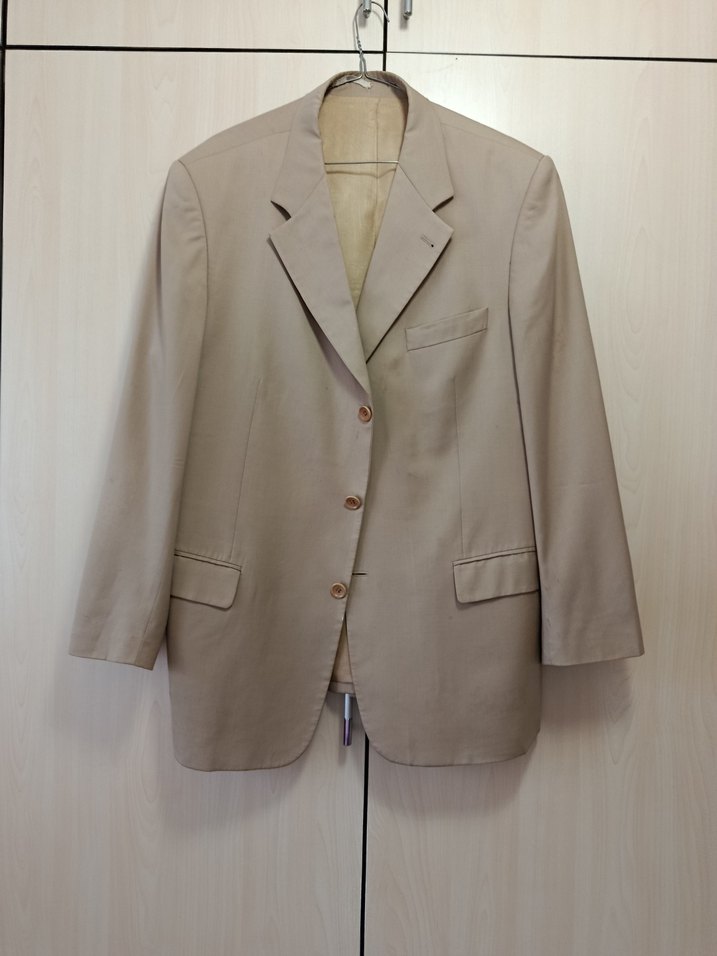 Bej renkte, notch yakalı erkek ceket. Düğmeli, uzun kollu ve klasik kesim, ofis için uygun sade tasarım. Biraz kirli kuru temizlemeye gitmesi lazım fiyat uygundur pazarlık olmaz