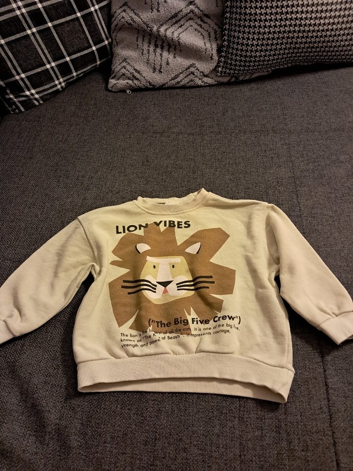 Açık bej renkli, uzun kollu, bol kesim erkek çocuk sweatshirtü. Üzerinde baskılı aslan figürü ve kürk detayları bulunur. Yumuşak ve sıcak kumaştan üretilmiştir.