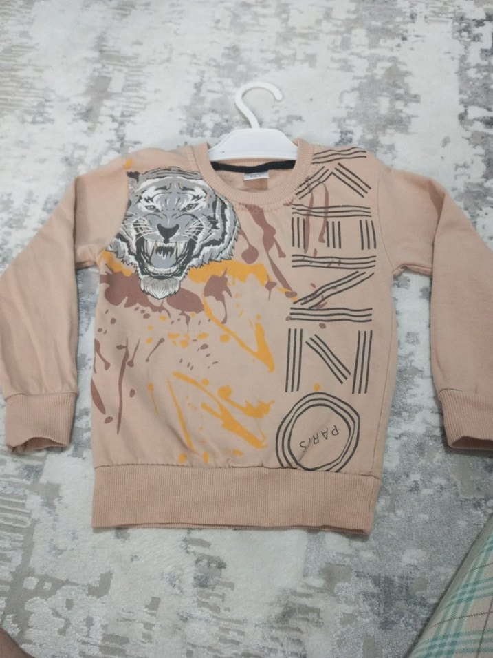 Bej renkli, uzun kollu ve bisiklet yaka erkek çocuk sweatshirtü. Yumuşak ve sıcak kumaştan, bol kesim. Kaplan baskısı ve kürk detaylıdır.