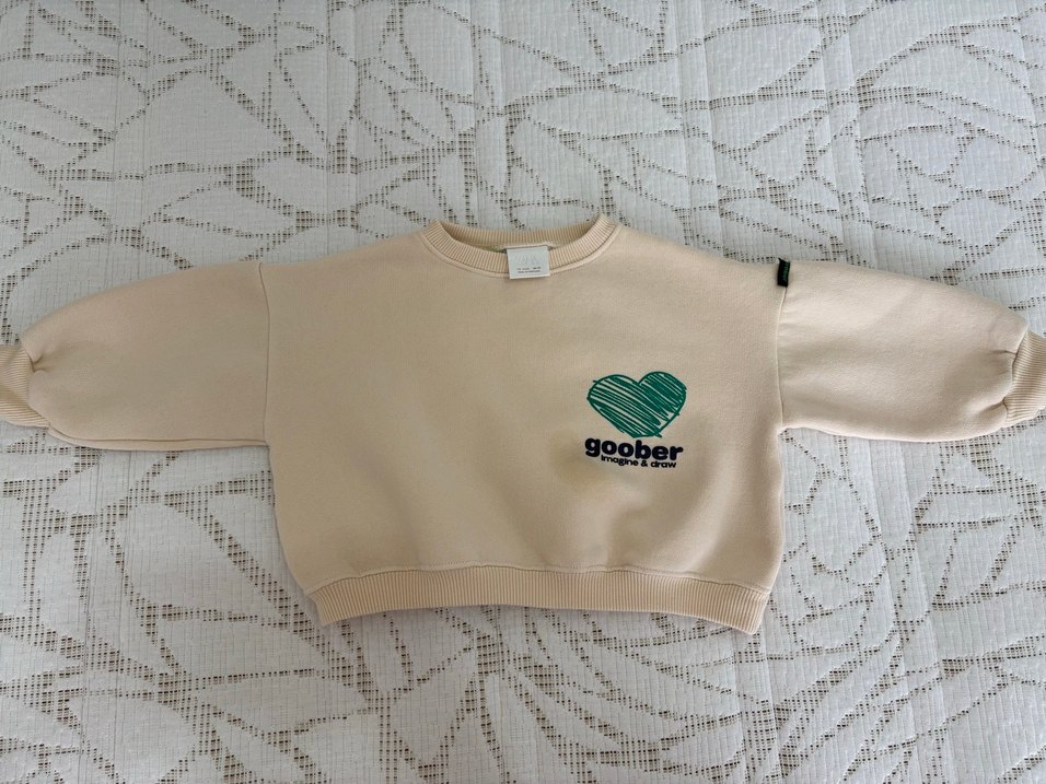Bej renkli, bisiklet yaka ve uzun kollu erkek çocuk sweatshirtü. Örgü pamuk kumaş ve bol kesim. Önünde yeşil kalp ve 'goober' baskısı bulunur.