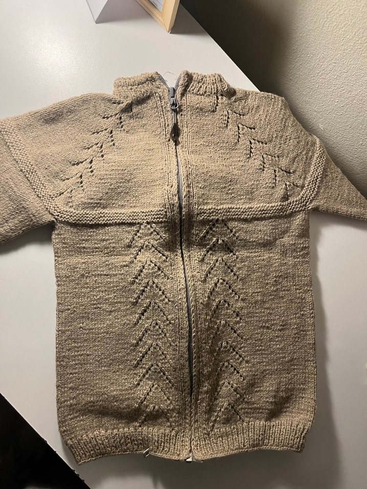 Bej renkli, uzun kollu, fermuarlı ve bohem tarzda örgü erkek çocuk hırkası. Fitted kesimi ve yumuşak dokusuyla konfor sağlar.