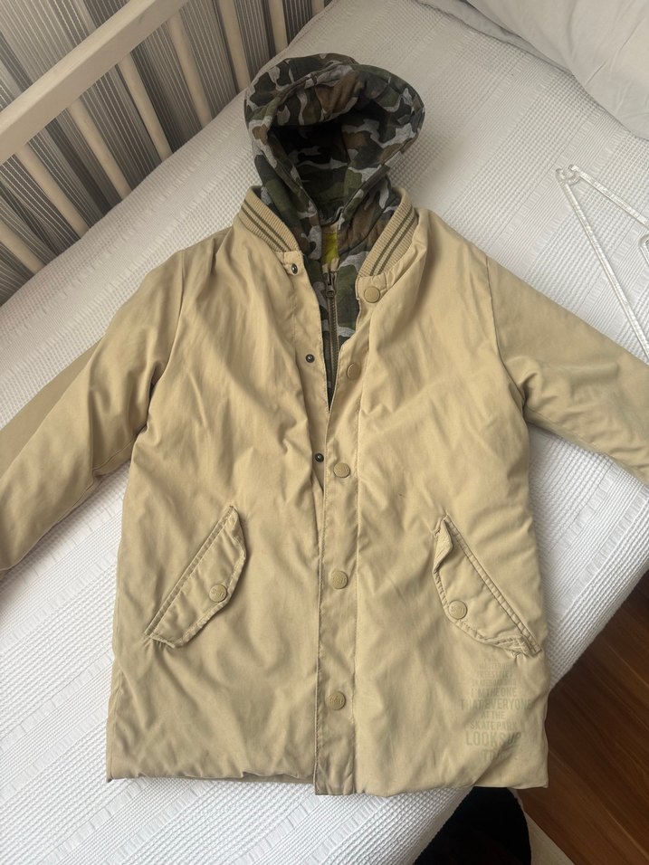Bej renkli, düğmeli ve yakalı erkek çocuk kabanı, bol kesim ve basic tarzıyla dikkat çekiyor. Sentetik kumaştan üretilmiştir.