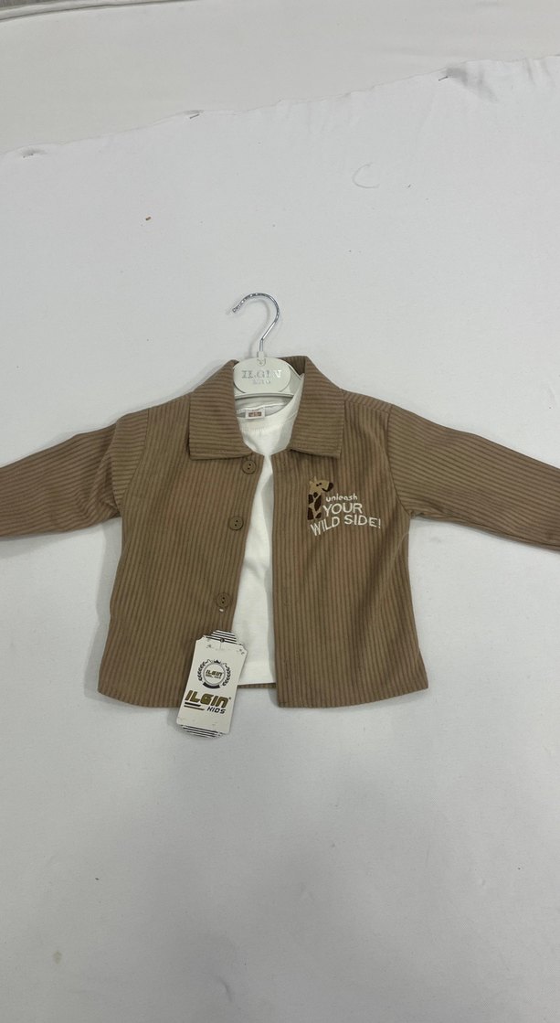 Bej renkli, düğmeli ve kesimli yaka detaylı erkek çocuk ceketi. Yumuşak kumaş ve baskılı desenle rahat, günlük tarz için uygun. İmalathaneden cocuk gıyım