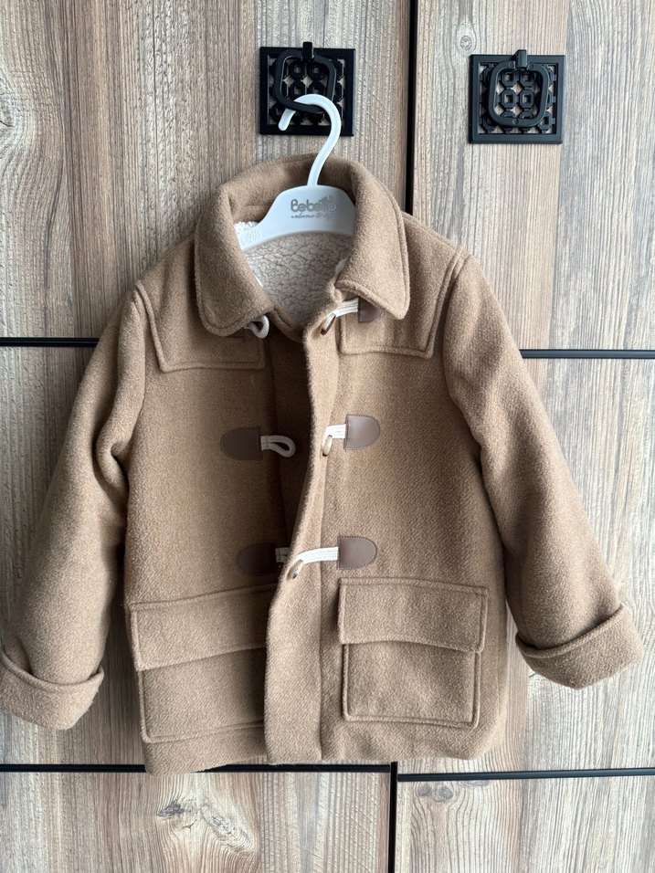 Bej renkli, düğmeli, yakası kesimli ve yumuşak, sıcak tutan kumaştan erkek çocuk kabanı. Rahat kesim ve sokak stiline uygun.