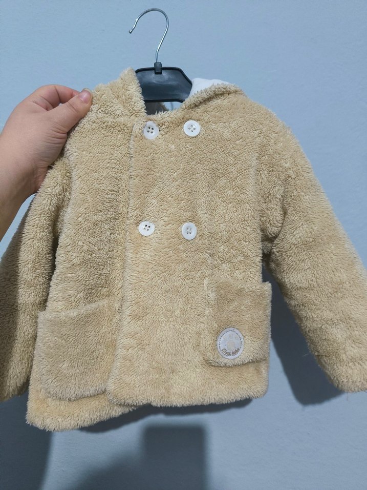 Bej renk, düğmeli ve yakalı erkek çocuk kabanı. Yumuşak ve sıcak kumaştan, bol kesim ve ön ceplerle. Sade, sokak stili tarzında.