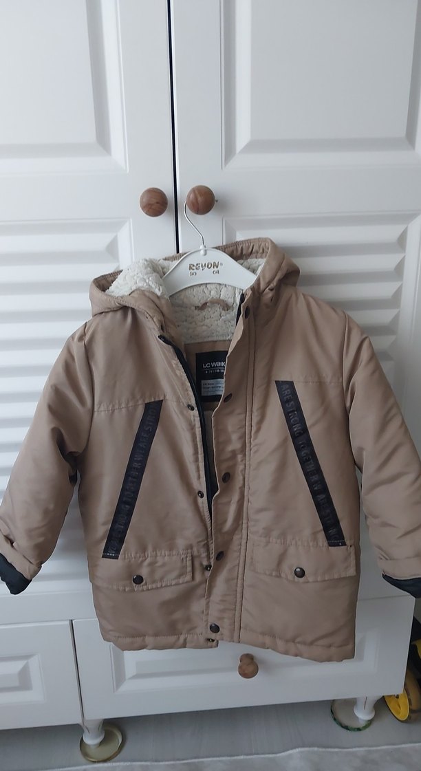 Bej renkli, düğmeli ve yaka detaylı erkek çocuk montu, yumuşak ve sıcak kumaş astara sahip, gri detaylarla tarz bir görünüm sunar.
