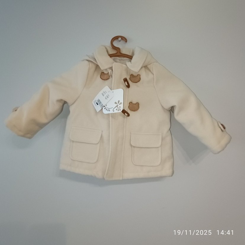 Bej renkte, düğmeli ve baskılı detaylara sahip kız çocuk polar kaban. Yumuşak, sıcak kumaştan, regular fit ve iki ön cepli.