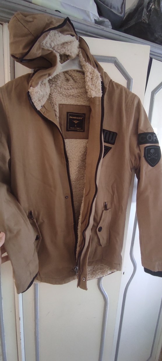 Bej renkli, düğmeli, bol kesim erkek çocuk kabanı. İç kısmı yumuşak tüylü kumaşla kaplıdır. kol ile göğüste bulunan patch detaylarıyla street wear tarzı sunar.
