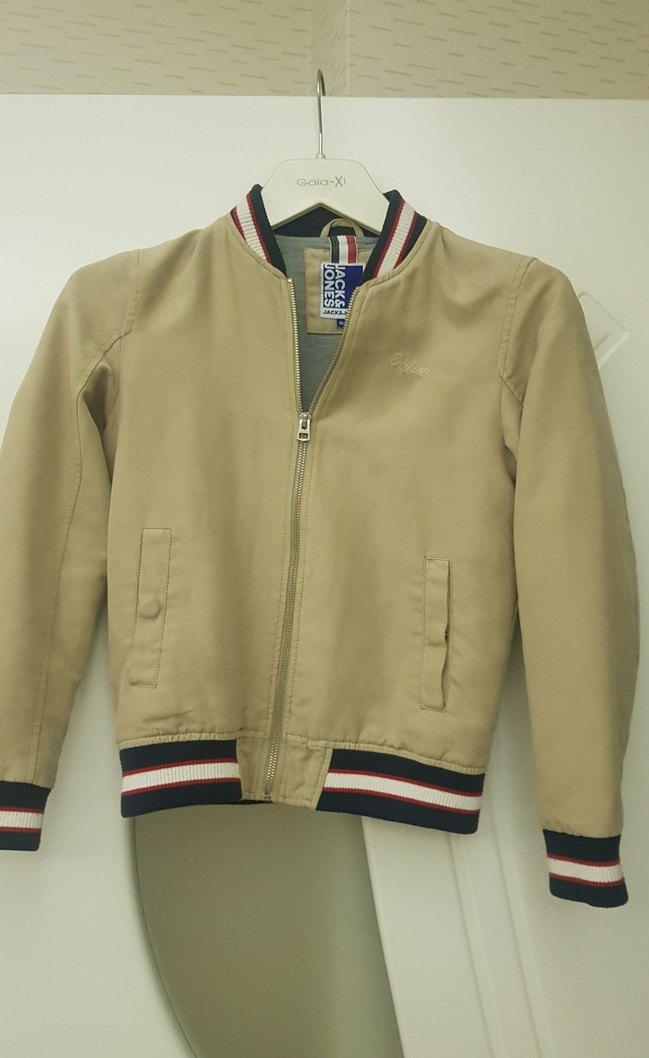 Bej renkli, fermuarlı erkek çocuk ceketi. Notlu yaka, normal kesim ve yumuşak, sıcak kumaştan üretilmiştir. Manşet ve etek kısmında çizgili ribana detaylar bulunur.