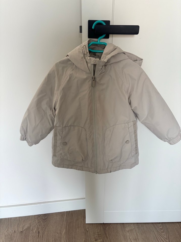 Fermuarlı, bej renkli, düz desenli, yumuşak ve sıcak kumaştan yapılmış yağmurluk. Temiz kullanıldı