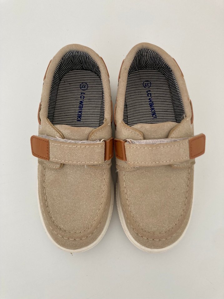 Bej renkli, cırt cırtlı ve kauçuk tabanlı erkek bebek ilk adım ayakkabısı. Düz ve sokak tarzı rahat tasarım.