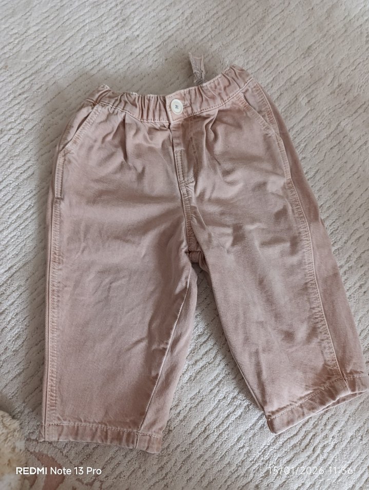 Bej renkli keten kumaştan, bol kesim erkek çocuk pantolonu. Düz ve pastel tonlarda, rahat ve sade bir stil sunar.