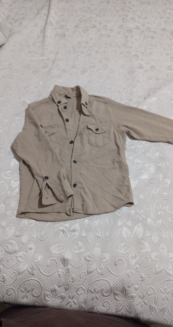 Bej renkli, keten kumaştan, uzun kollu ve düğmeli erkek çocuk gömleği. Notlu yaka ve rahat kesimiyle sokak stili için uygun.