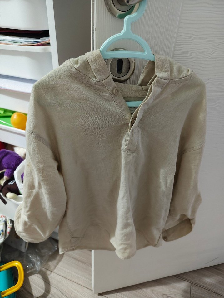Bej renkli keten kumaştan, uzun kollu, yakalı ve düğmeli erkek çocuk gömleği. Rahat kesimiyle günlük sokak stili için uygundur.