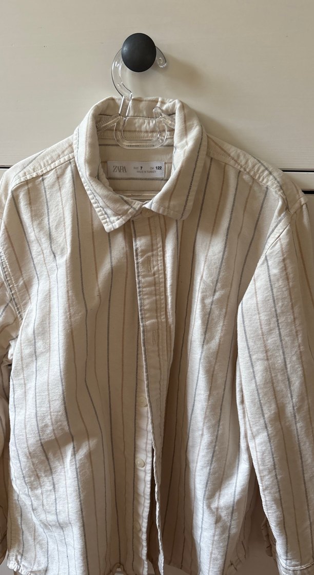 Yumuşak keten kumaştan yapılmış, düğmeli ve yakalı, uzun kollu bol kesim bej erkek gömleği. Günlük kullanım için uygundur, gri ince çizgilerle minimal ve normcore tarzda.