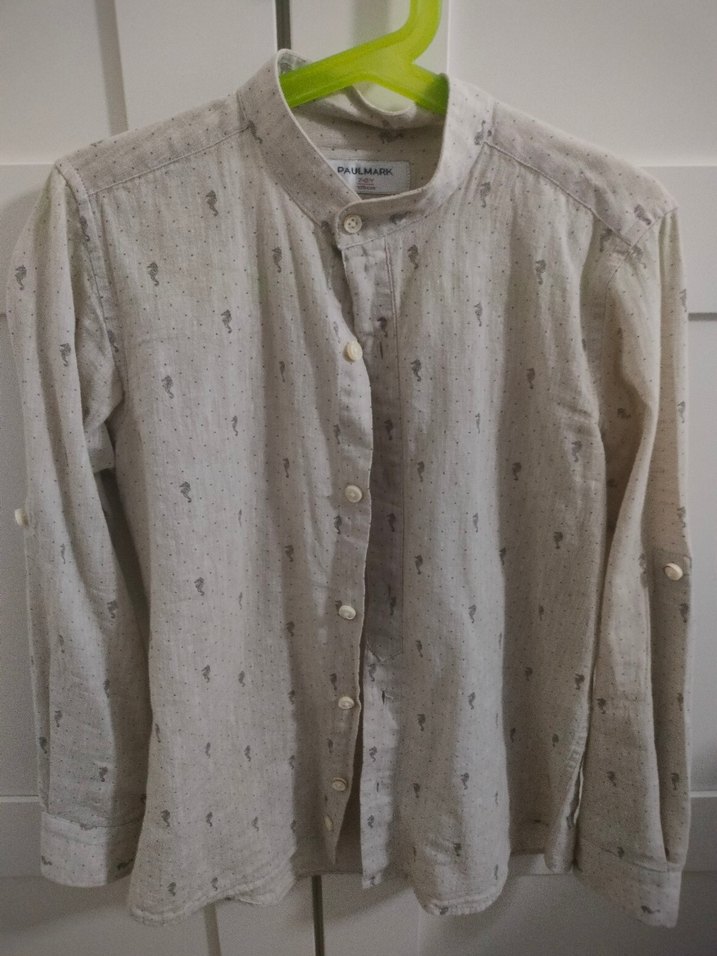 Bej renkli keten erkek çocuk gömleği, uzun kollu ve düğmeli. Bohem tarzda, bej desenler ve salaş kesime sahip.