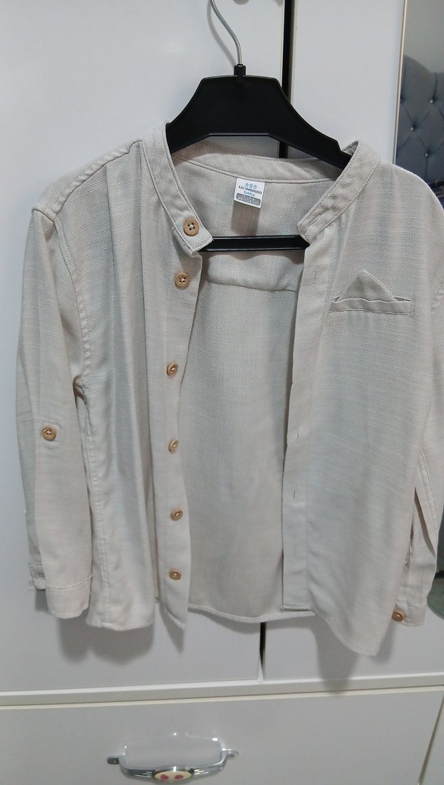Bej renkli, keten kumaştan uzun kollu erkek çocuk gömleği. Çentikli yaka, düğmeli ve cep detaylı, rahat kesim sokak stili için uygun.