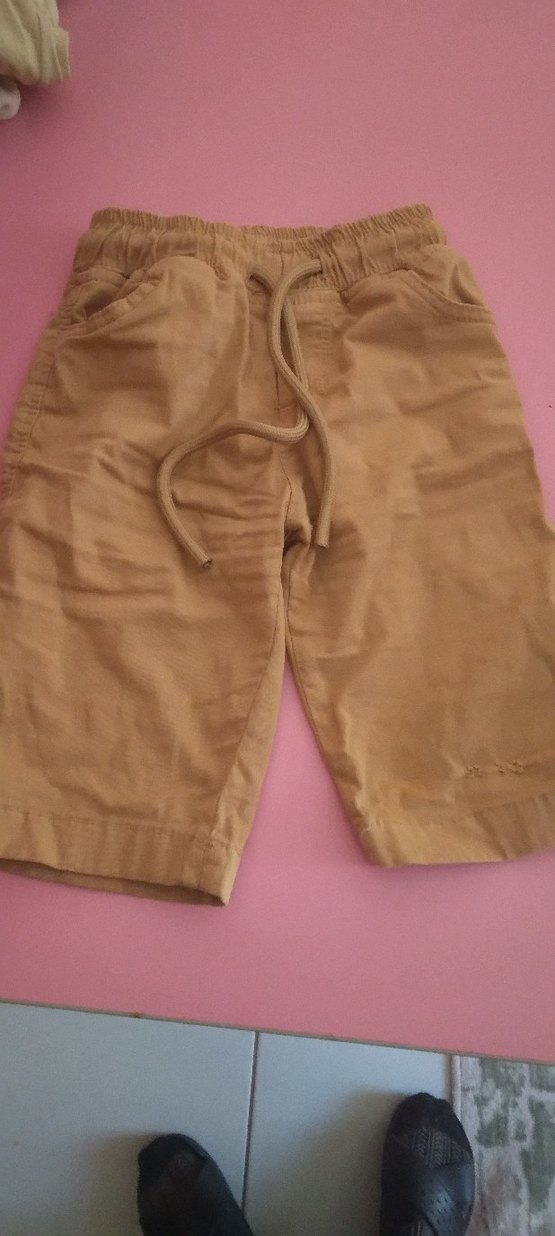 Bej renkli, keten kumaştan salaş kesim erkek çocuk şortu, rahat ve şık bir sokak stili sunar. ufak bir deposu var fotoda belirttim