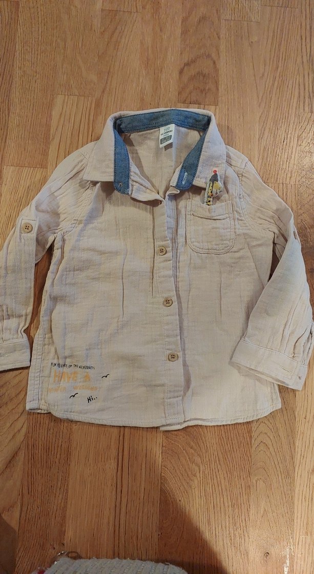 Bej keten kumaştan, notalı yakalı ve düğmeli uzun kollu erkek çocuk gömleği. Kollar kıvrılıp, düğmeleniyor. Regular fit ve bohem tarzda, pastel tonlarda. Sadece birkaç kez kullanılmış, cok iyi durumda.