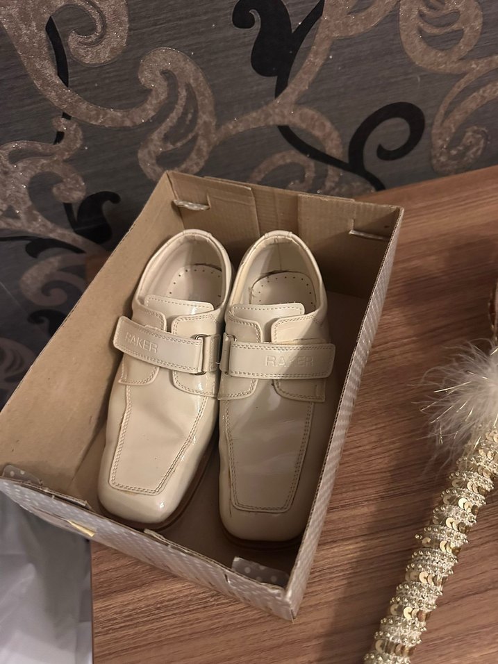 Bej renkli, tokalı erkek çocuk özel gün ayakkabısı, kauçuk malzemeden, sokak stiline uygun.