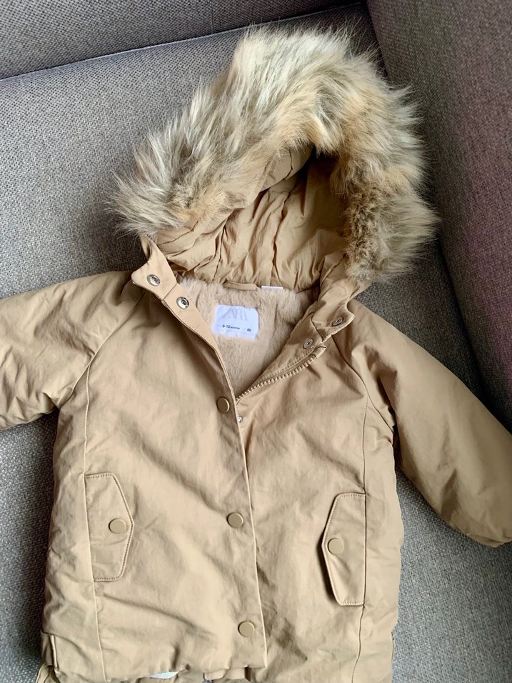 Bej renk, bol kesim erkek çocuk montu, kürklü kapüşon ve çıtçıtlı ceplerle. Yumuşak ve sıcak kumaştan üretilmiştir.